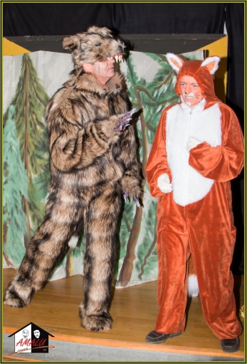 ![]() Die Mutter schickt das Rotkäppchen mit einem Kuchen zur kranken Großmutter. ![]() Das Rotkäppchen trifft auf den Holzmichl, der ihr von der Rückkehr des Wolfs erzählt. ![]() Der Fuchs bietet Rotkäppchen seine „zweifelhafte“ Hilfe an. ![]() Hase, Igel und Maus sind die wahren Freunde vom Rotkäppchen. ![]() Die Tiere und das Rotkäppchen spielen Verstecken. ![]() Danach bekommen alle Hunger und essen den ganzen Kuchen auf, der eigentlich für die Großmutter bestimmt war. ![]() Der Holzmichl beauftragt die Tiere, auf Rotkäppchen aufzupassen. ![]() Rotkäppchen bekommt von der Mutter einen neuen Kuchen, den es aber dieses Mal wirklich zu Großmutter bringen soll. ![]() Die Tiere versprechen Rotkäppchen, nach dem Wolf Ausschau zu halten. ![]() Der Holzmichl „trifft“ auf seinen Freund, den Jäger. ![]() Der Bär will das Rotkäppchen beschützen ... ![]() ... und geht voraus. ![]() Der listige Fuchs schickt Hase, Igel und Maus ins Dorf, damit sie Rotkäppchen nicht helfen können. ![]() Der Wolf lobt den Fuchs für seine Taten. ![]() Der Bär freut sich gar nicht, dass der Wolf zurückgekehrt ist. ![]() Mit der falschen Aussicht auf Honig kann der Wolf den Bären aus dem Wald fortlocken. ![]() Der Wolf gaukelt Rotkäppchen vor, dass er nur ein „herrenloser“ Hund sei. ![]() Der Wolf schleicht sich in das Vertrauen des Rotkäppchens. ![]() Rotkäppchen lässt sich vom Wolf zum Blumen pflücken verleiten. ![]() Der Wolf indessen schleicht sich zum Haus der Großmutter. ![]() Der Wolf gibt sich mit verstellter Stimme als Rotkäppchen aus, findet den Schlüssel, dringt ins Haus der Großmutter ein und verschlingt sie in einem Stück. ![]() Rotkäppchen wundert sich über die großen Ohren, erkennt aber nicht, dass sich der Wolf im Bett ihrer Großmutter befindet. ![]() Der Wolf springt aus dem Bett und verschlingt auch das Rotkäppchen. ![]() Der Holzmichl erkennt, dass anstatt der Großmutter der Wolf im Bett liegt. ![]() Der Jäger kommt zur Hilfe und bemerkt, dass sich im Bauch des Wolfes jemand befindet. Holzmichl und Jäger wollen mit einer Schere die Großmutter zurückholen. ![]() Rotkäppchen und Großmutter werden aus dem Bauch des Wolfes befreit. ![]() Der Jäger darf den Wolf nicht erschießen, da Rotkäppchen eine bessere Idee hat. ![]() Es werden Steine in den Bauch des Wolfes gelegt und die Großmutter näht alles wieder zu. ![]() Der Wolf ist erwacht und bricht kurz darauf tot zusammen. ![]() Alle sind wieder glücklich vereint. ![]() Amalu e.V. 2015 - Rotkäppchen Veröffentlichung mit freundlicher Genehmigung von Dietmar Grimm. Hier könnt ihr weitere spezielle Fotos zu den Kostümen sehen!